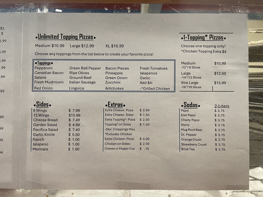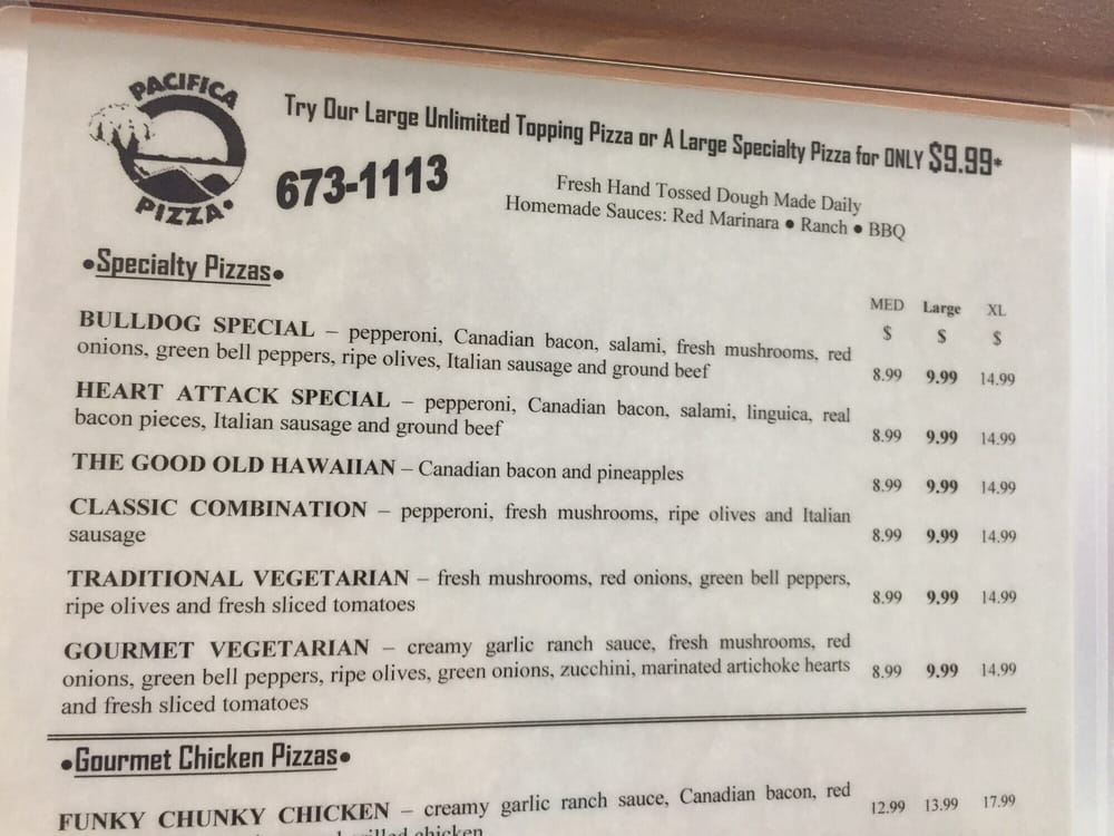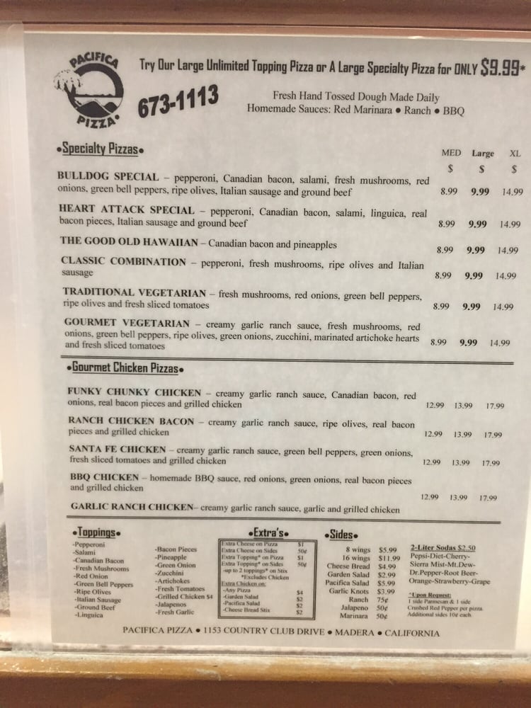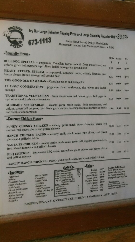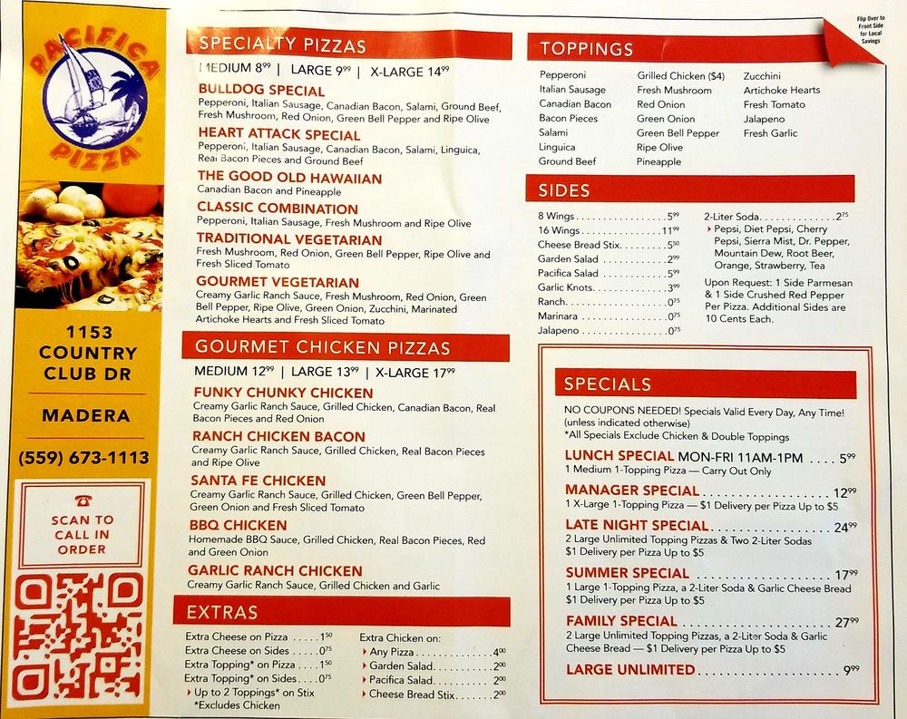 Introducing Pacifica Pizza, a pizzeria located in Madera, CA, known for its delicious pizzas and excellent service. Despite its casual ambiance and lack of dine-in options, Pacifica Pizza offers a wide range of menu items, including vegan and vegetarian options, catering to all dietary preferences. The restaurant provides delivery and takeout services, ensuring that customers can enjoy their hot and tasty pies conveniently. Customers praise the quality and quantity of the pizzas, with many highlighting the affordable prices and quick service. With positive reviews emphasizing the flavorful crust and generous toppings, Pacifica Pizza is a must-try spot for pizza lovers on the go. Don't miss out on their $12 special and experience the best pizza in Madera!